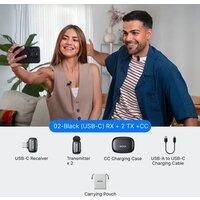 | Комплект поставки | - 2 передатчика, - приемник (USB-C), - зарядный кейс, - кабель USB-A - USB-C для зарядки, - сумка для переноски, - стандартная поролоновая ветрозащита |